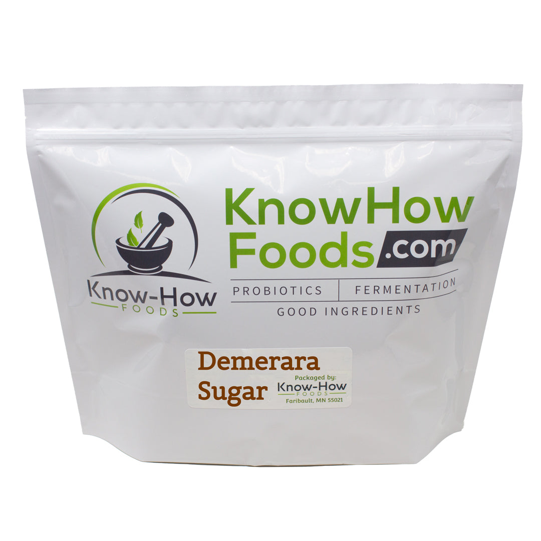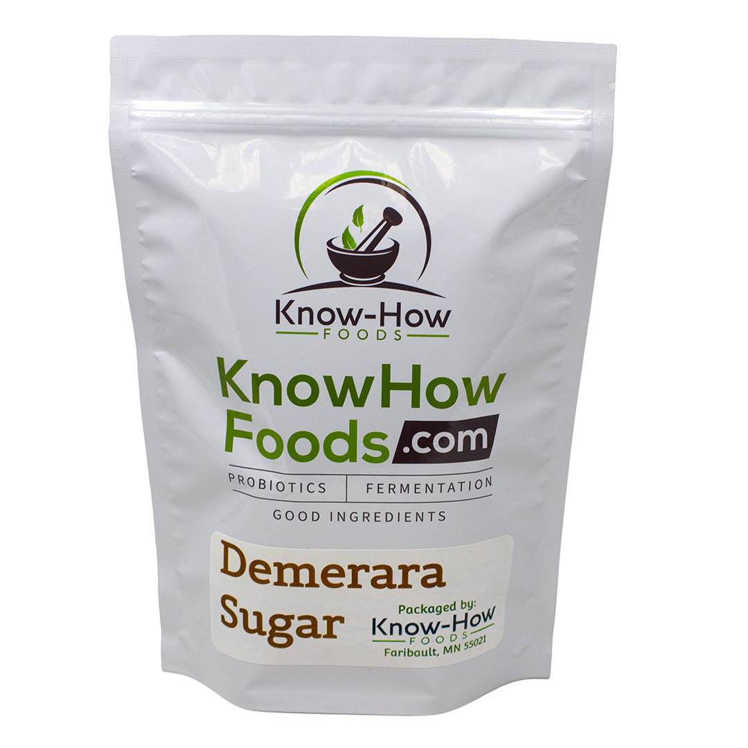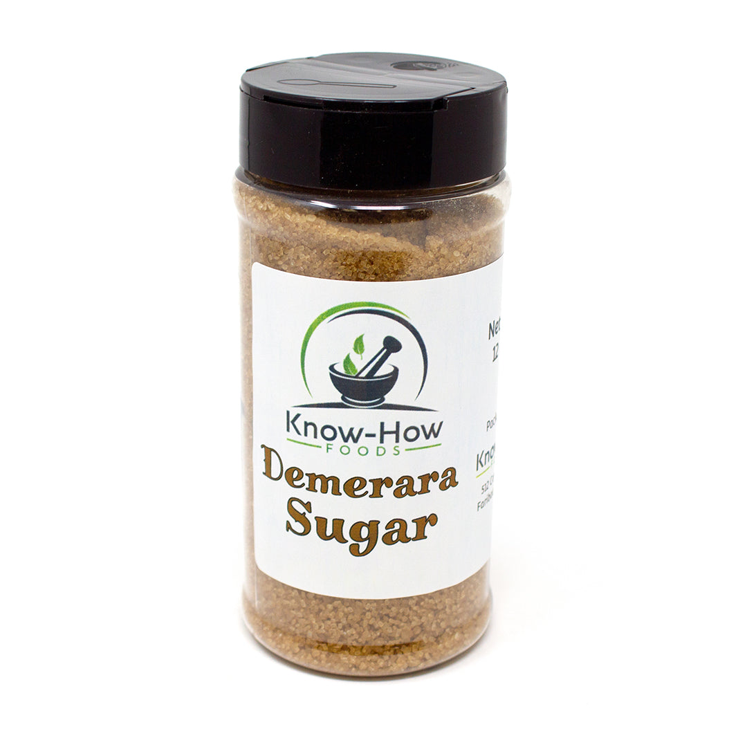 Demerara sugar, also known as turbinado, is a raw cane sugar often used in home baking and for sweetening beverages. Its crystals are coarse and brown, with a rich molasses flavor. Less processed than refined sugar, and with more nutrients, it is not made by adding molasses to processed sugar; rather, it comes straight from sugar cane juice. The juice is spun in a turbine, causing the water to evaporate and the sugar to crystallize into coarse demerara.