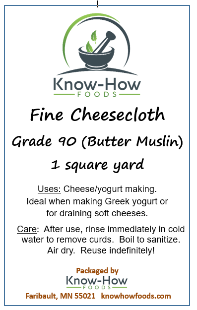 Premium, fine-weave cheesecloth for straining yogurt, butter, or soft cheeses. Known as "butter muslin." Grade 90. Washable and reusable. Individual yard is packaged with instructions. By the yard is cut to length.