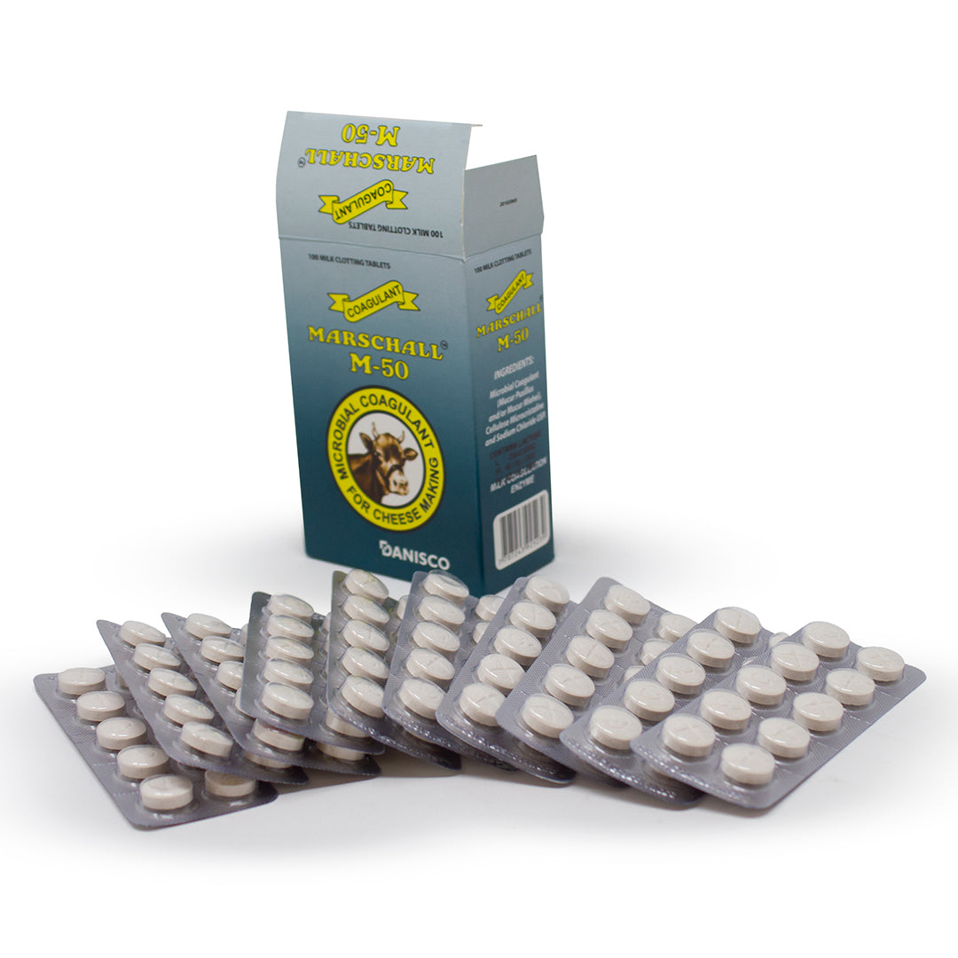 A reliable rennet with a long shelf life! These vegetarian tablets for coagulating milk are microbial, derived from mucor pusillus and/or mucor miehei. Conveniently scored into quarters. Shelf-stable for 2 years, and even longer in the freezer.