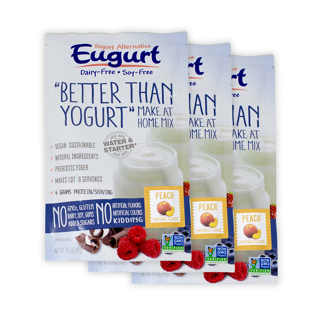 Eugurt is the perfect dairy-free yogurt alternative for those looking for a healthier snack! Perfectly balanced with clean ingredients, low sugar, and high protein, you can make 6 delicious servings without additives or preservatives. Simply add water and starter culture, follow the simple instructions, and enjoy the refreshing peach flavor and prebiotic goodness of your own creation!