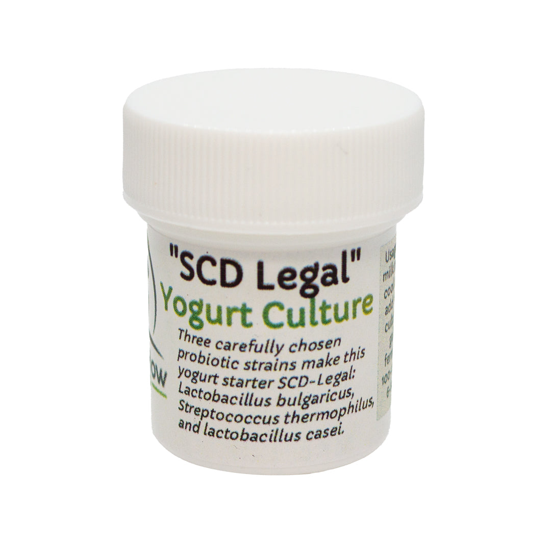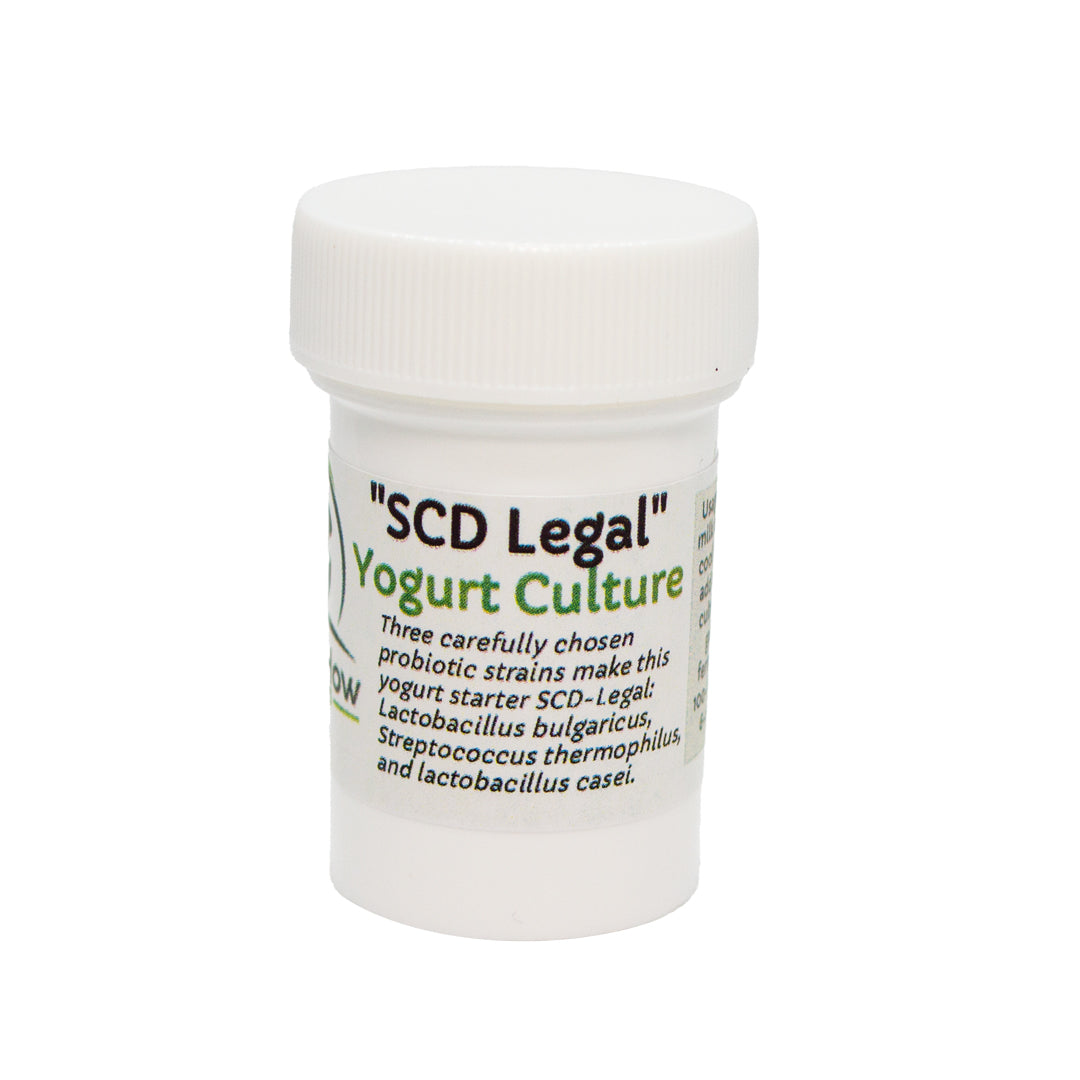For those following a Specific Carbohydrate Diet. Three carefully chosen probiotic strains make this yogurt starter SCD-Legal: Lactobacillus bulgaricus, Streptococcus thermophilus, and lactobacillus casei. The combination of these probiotic strains offers an excellent culture that will produce a mild acidifying flavor, smooth creamy consistency and texture as well as a pleasant taste. For use with dairy and non-dairy milks.